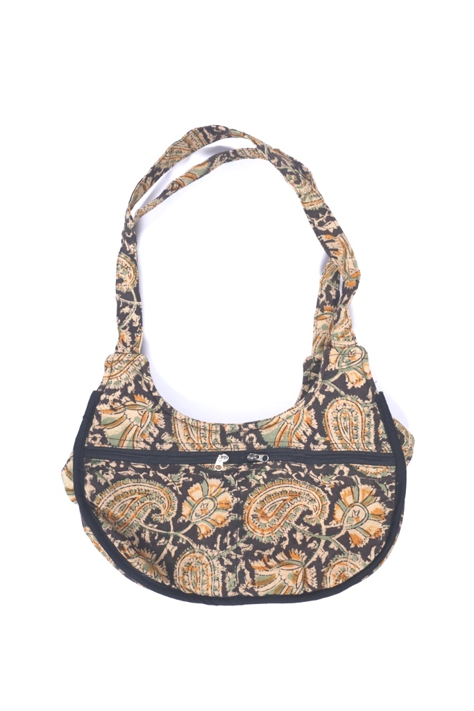 Stylish boat-shaped kalamkari fabric bag. Top zip and two zippers on the outside.