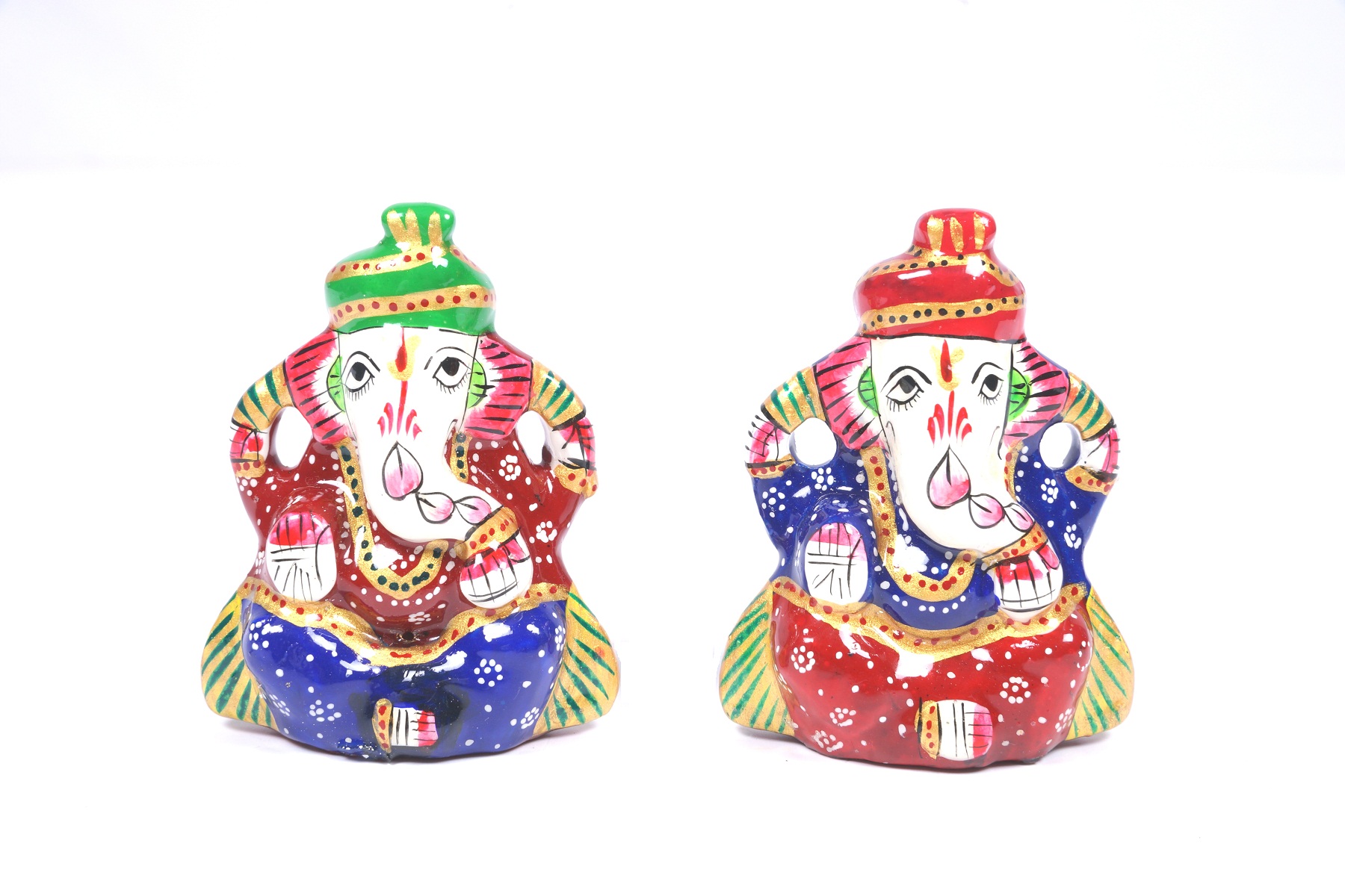 Rich looking mini Ganesha statue with delicate enamel painted by a skilled Indian craftsman, this statue in colorful glossy look and meenakari work reflects the artistic brilliance. This artifact is very appealing and eye-catching as home décor and collectible items. These are surprise gift items for your family and good return gift options for all occasions.