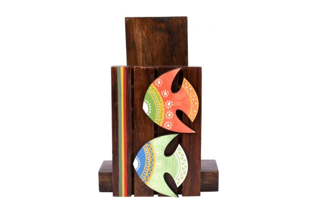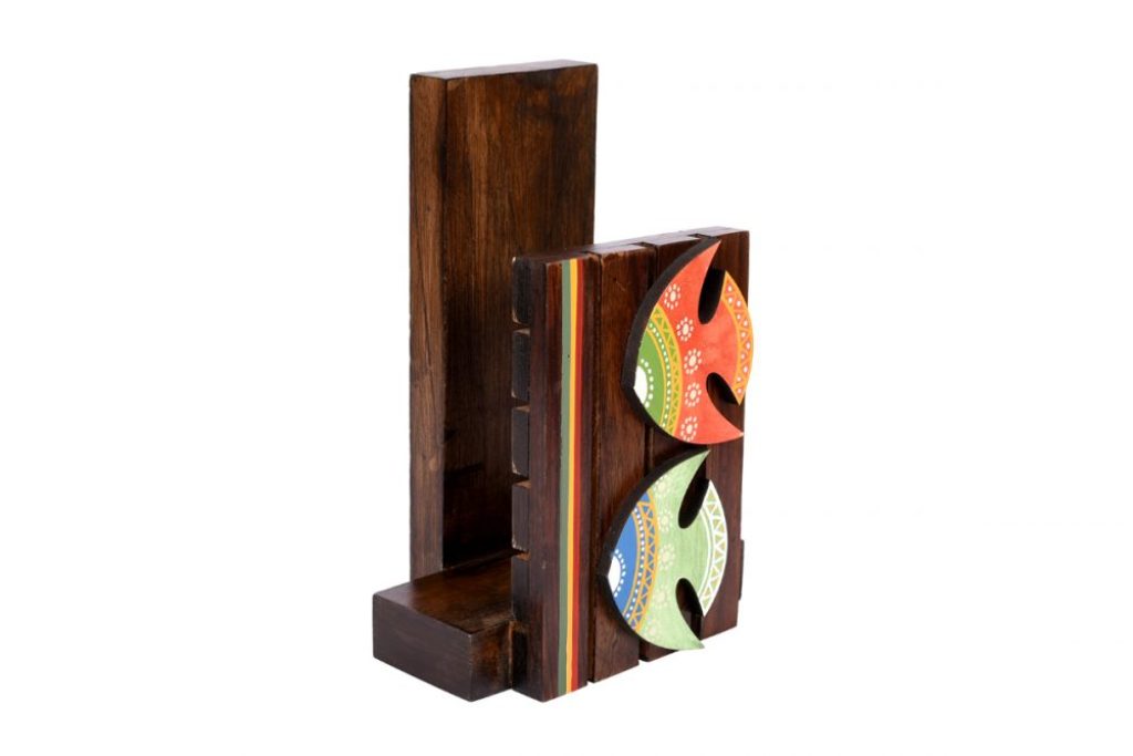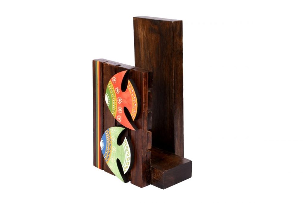 Stylish Towel holder to be placed in bathroom or kitchen to organize towel rolls. The Madhubani painted twin fishes add beauty to the holder. Handcrafted in pine wood.