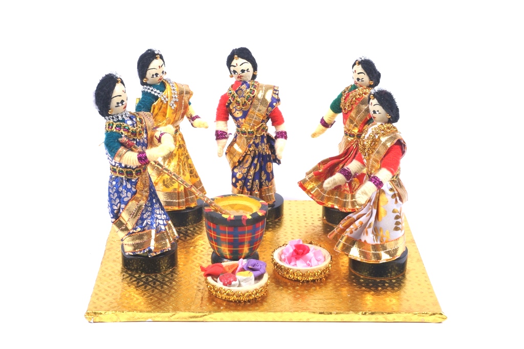 Exquisite handmade woolen doll set depicting South Indian traditional pre-wedding ceremony of making turmeric paste. In this ceremony, the turmeric paste is made and applied to both bride and groom before the wedding. The ladies in the family make the turmeric paste by the traditional method of powdering the turmeric. The lady dolls are dressed in traditional sarees.