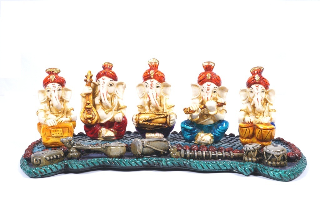 Beautifully crafted multi-colour Marble Dust Ganesh set of 5 playing Indian musical instruments like harmonium, veena,mrudangam , flute & tabla .This stunning home decor is handmade by traditional artisans. Invite Lord Ganesha to your home or office to add color, tranquility, and harmony to your surroundings. Lord Ganesh is the remover of all obstacles & bestows you with all-round success and joy in everything you do! Can be kept in your puja room or as a home or office decor item. Can be an ideal gift too!