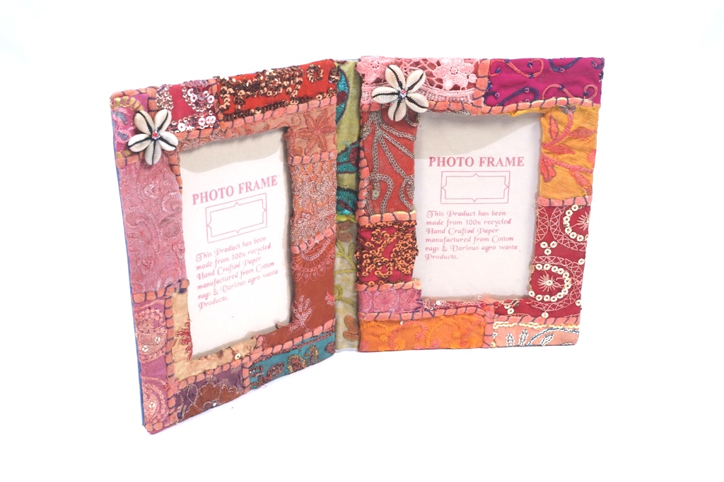 100% recycled eco-friendly handmade double photo frame with upcycled fabric and shell flower decoration. A gift for all occasions.