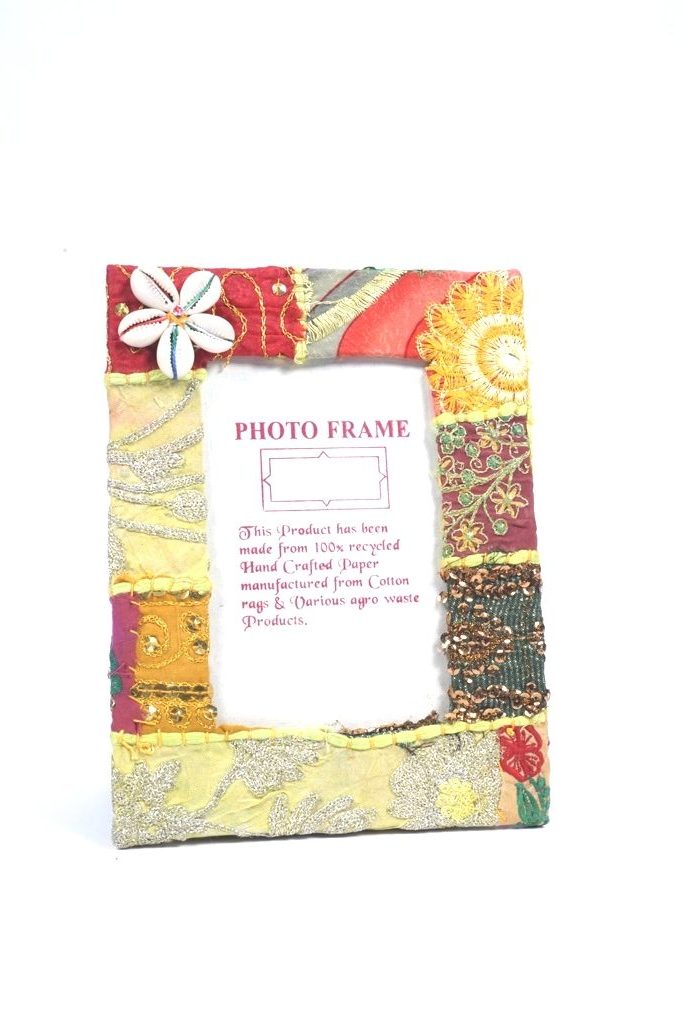 100% recycled eco-friendly handmade single photo frame with upcycled fabric and shell flower decoration. A gift for all occasions.