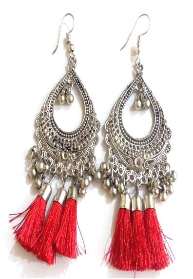 Stunning German silver drop earrings with colorful tassels and ghungroo. Perfect match for grand ethnic outfits like skirts, kurta, tunics, tops, sarees, and lehengas. A great gift option for your friend on a special occasion.